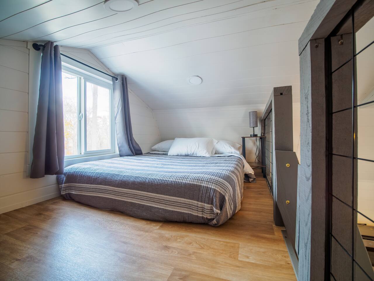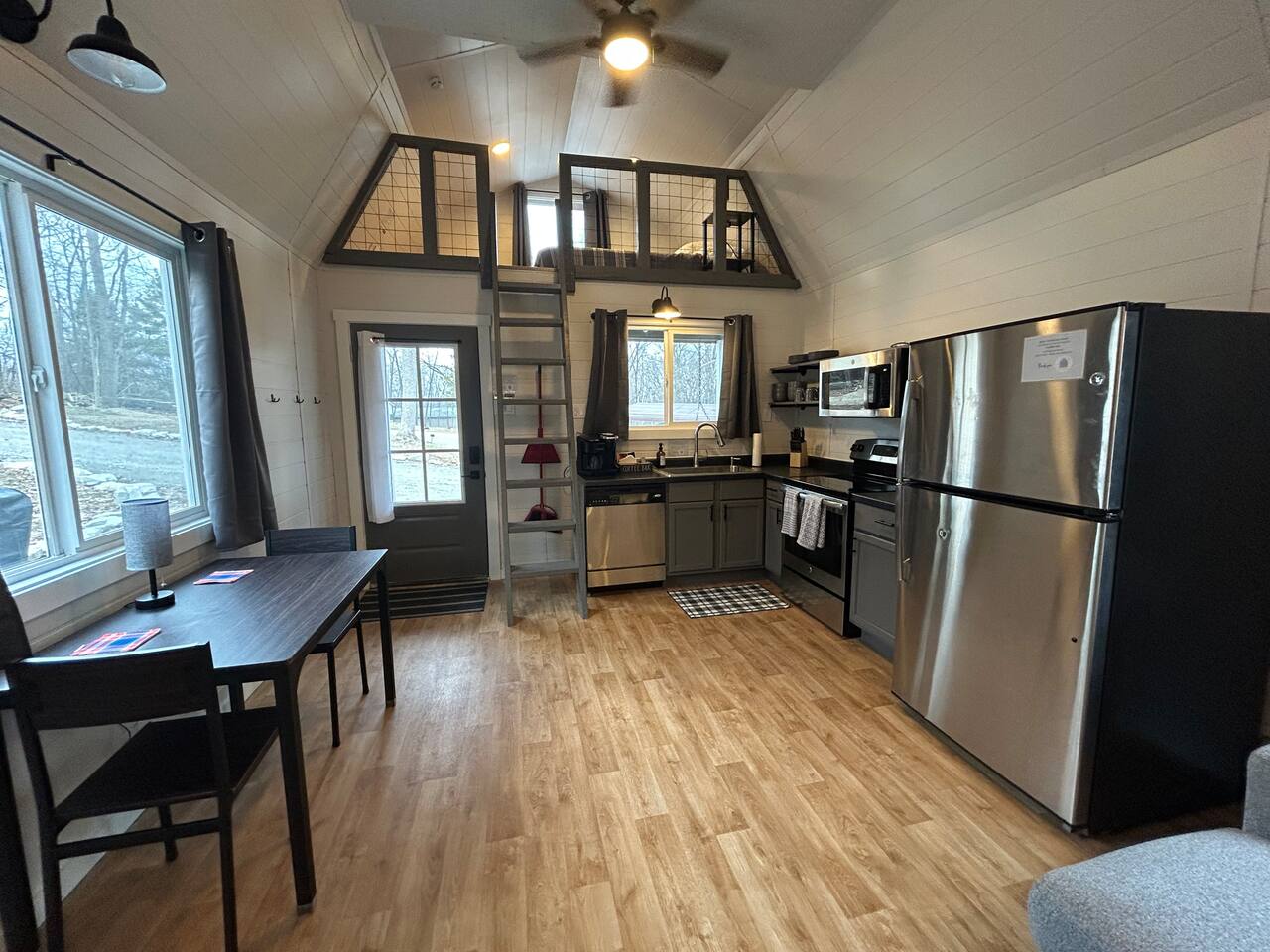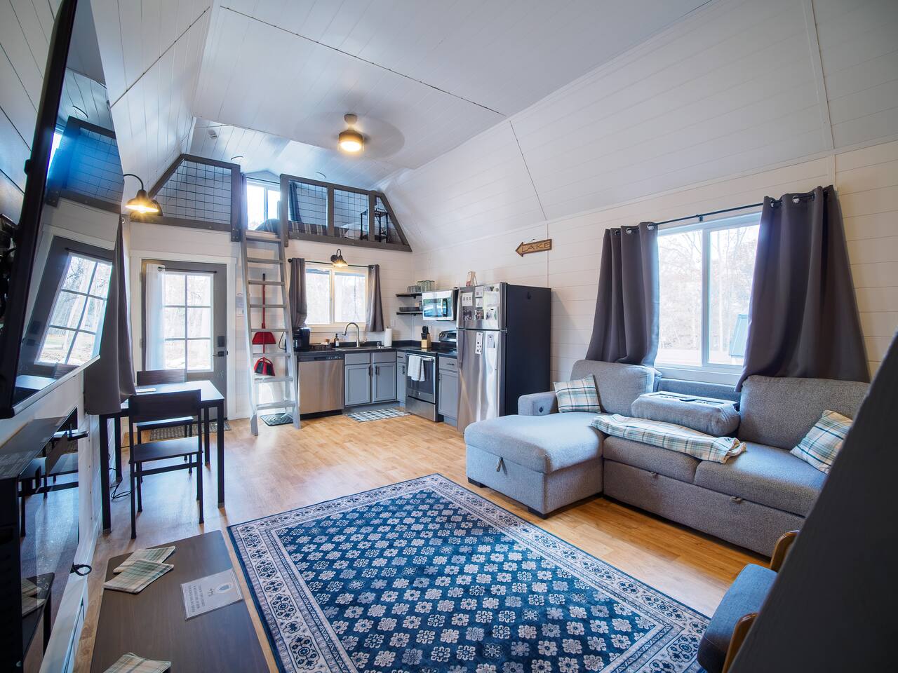 Guests have exclusive access to the entire Cozy Lofted Cabin and its designated outdoor recreation area located on the west side of the cabin. Dedicated parking spaces are available in front of the cabin, with a large gravel area to accommodate extra vehicles, trailers, boats, etc. Shared spaces on the property include lawn areas near the driveway and behind the cabin, as well as wooded areas for exploration.